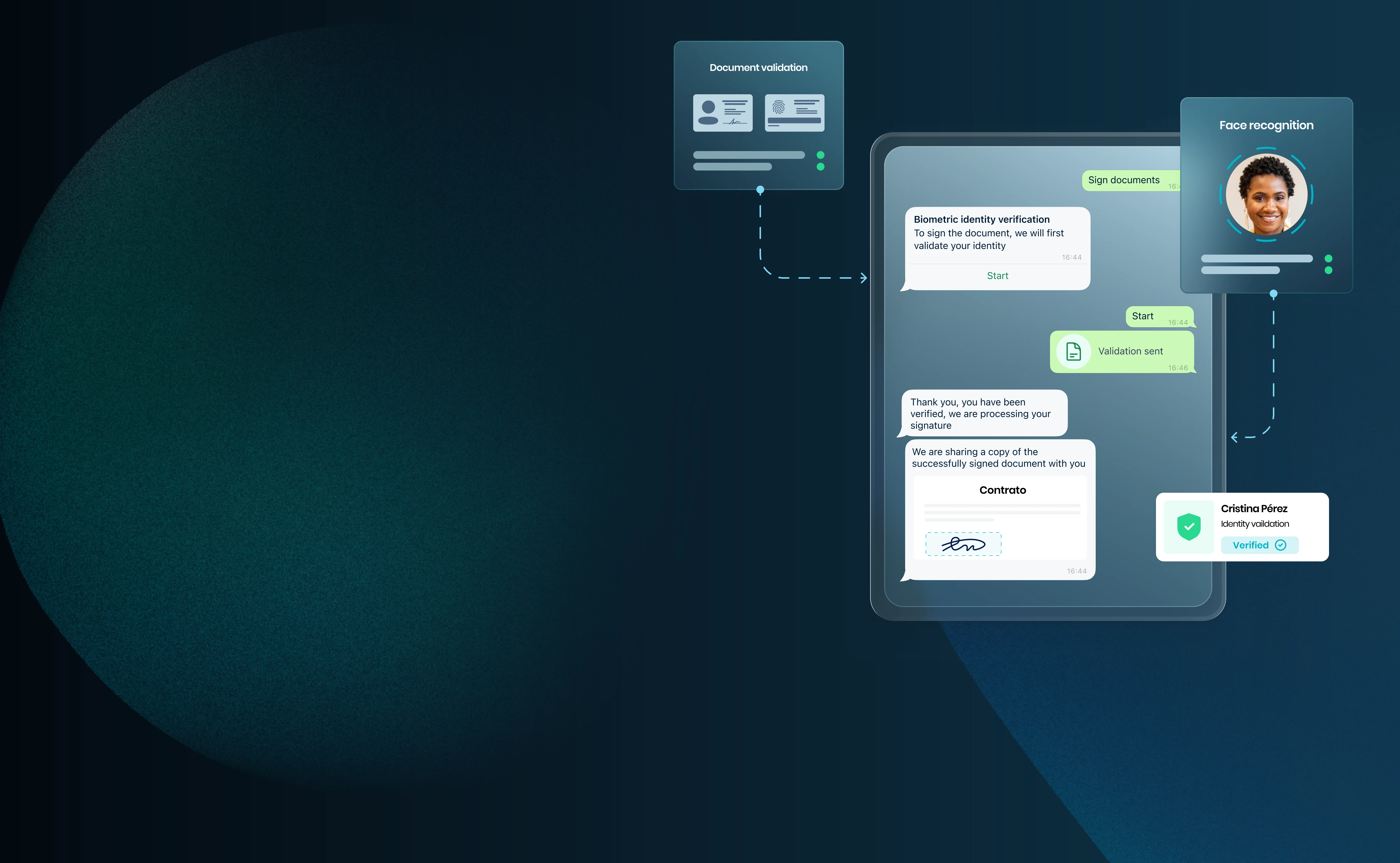 Verify customer identities and capture advanced electronic signatures (PAdES) right in WhatsApp, web-chat, or any channel—no external links, no apps to install.